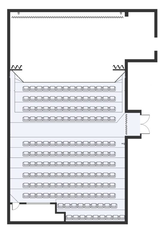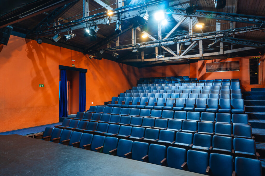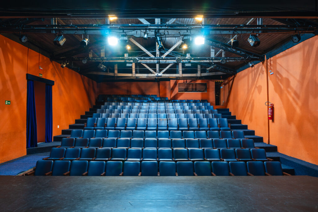 Nosso auditório conta com capacidade para até 180 espectadores, sendo 158 poltronas fixas e possibilidade de mais 22 cadeiras extras. Possui cabine completa para operação de iluminação e sonoplastia e dois camarins com sanitário exclusivo.
