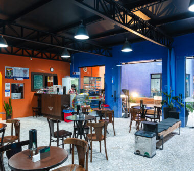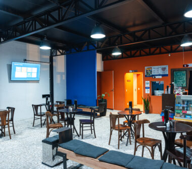 Logo na entrada, temos um amplo hall com o EnCena Café e diversas opções de doces, salgados e bebidas. O espaço conta também com bilheteria física.